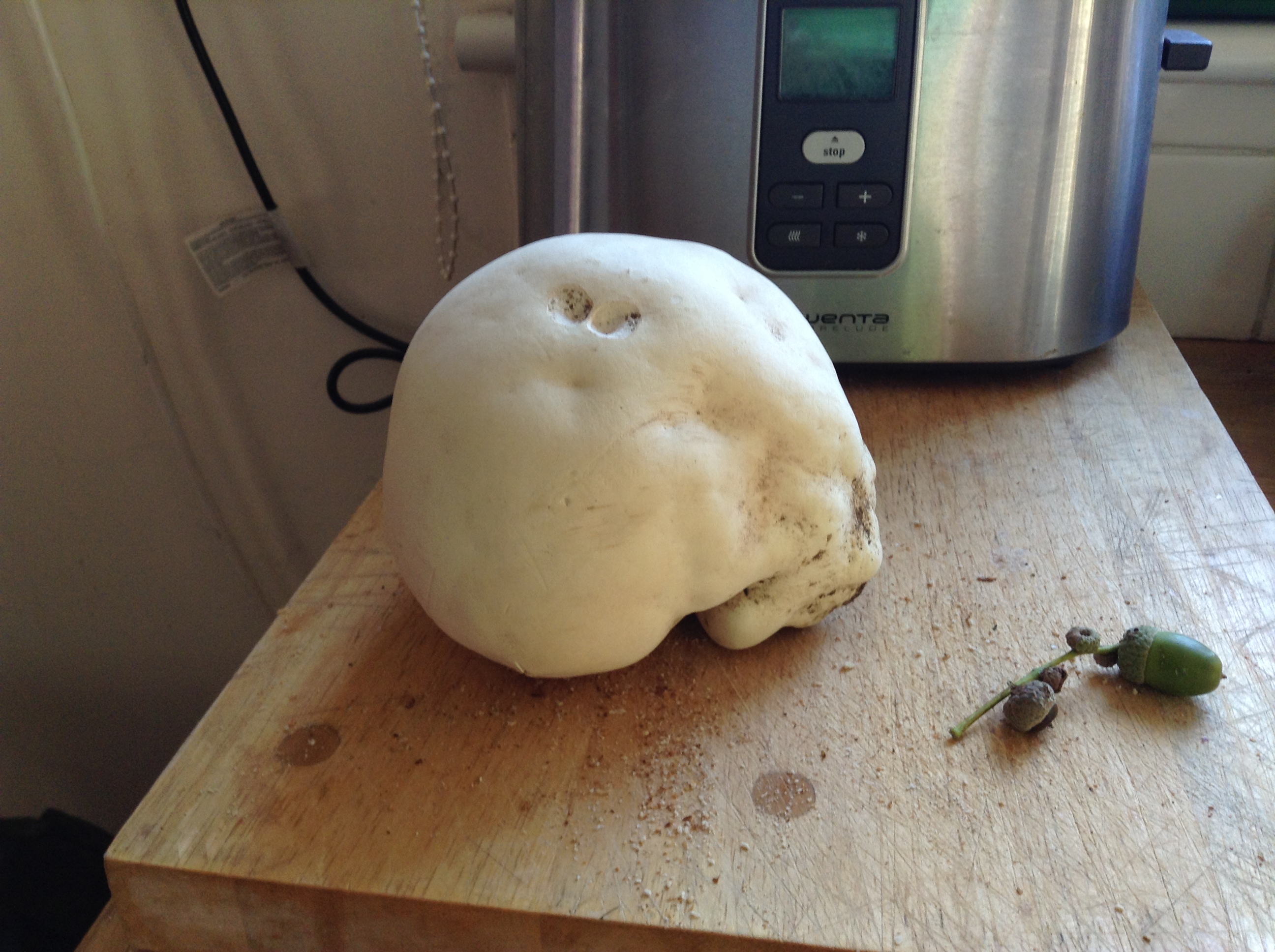 • It’s a giant puffball so yeh, kind of. I hear you on picking your own mushrooms. I am allergic to some of them so I can’t pick them either but basically, if you bruise the surface a little, just press it hard, and it goes yellow it means that it will make some people very ill. My brother and his wife picked some, she was horribly ill, he was fine. With you on the kids, too. I gave McMini a tiny bit and waited 24 hours before I gave him any more.