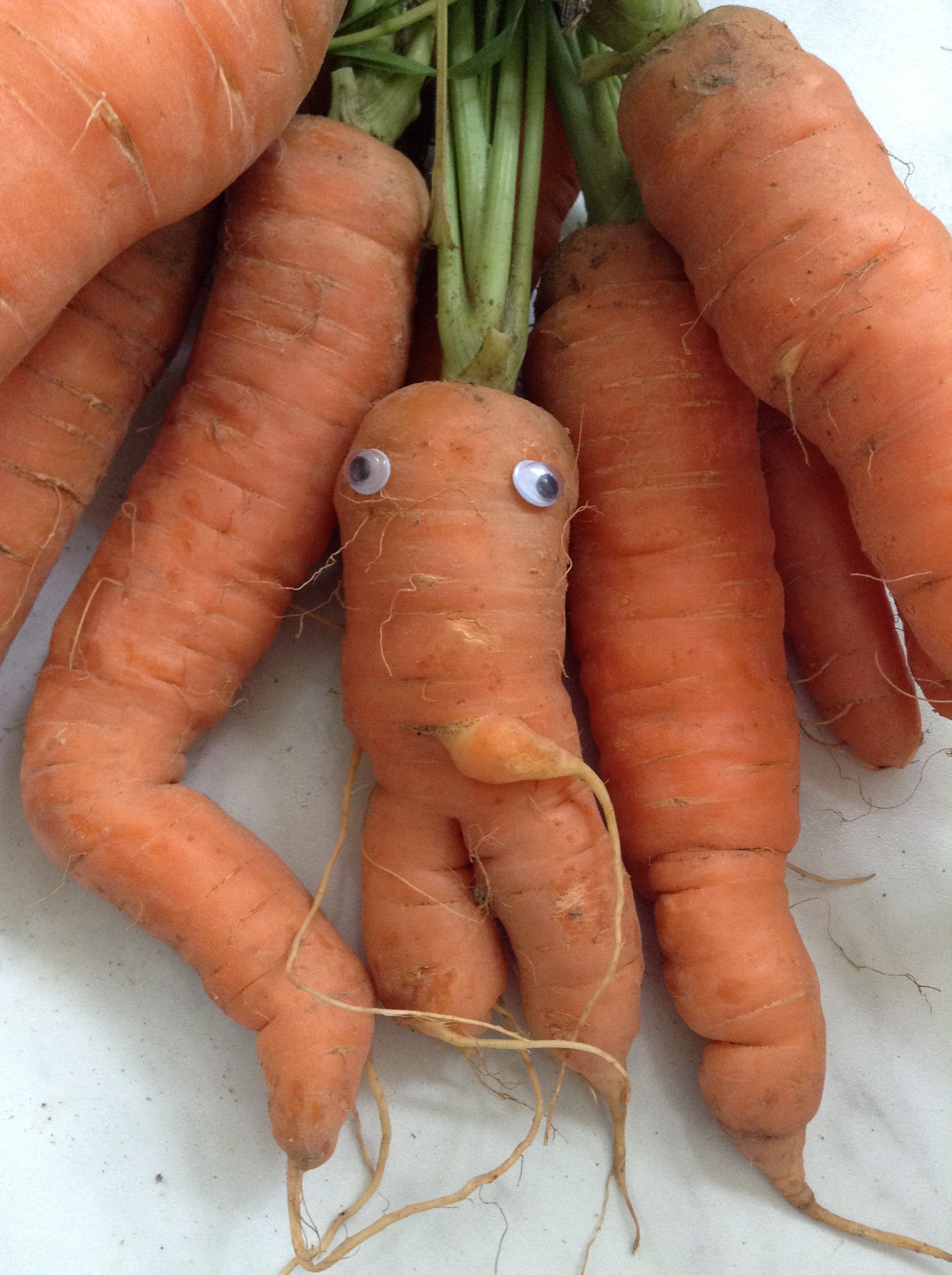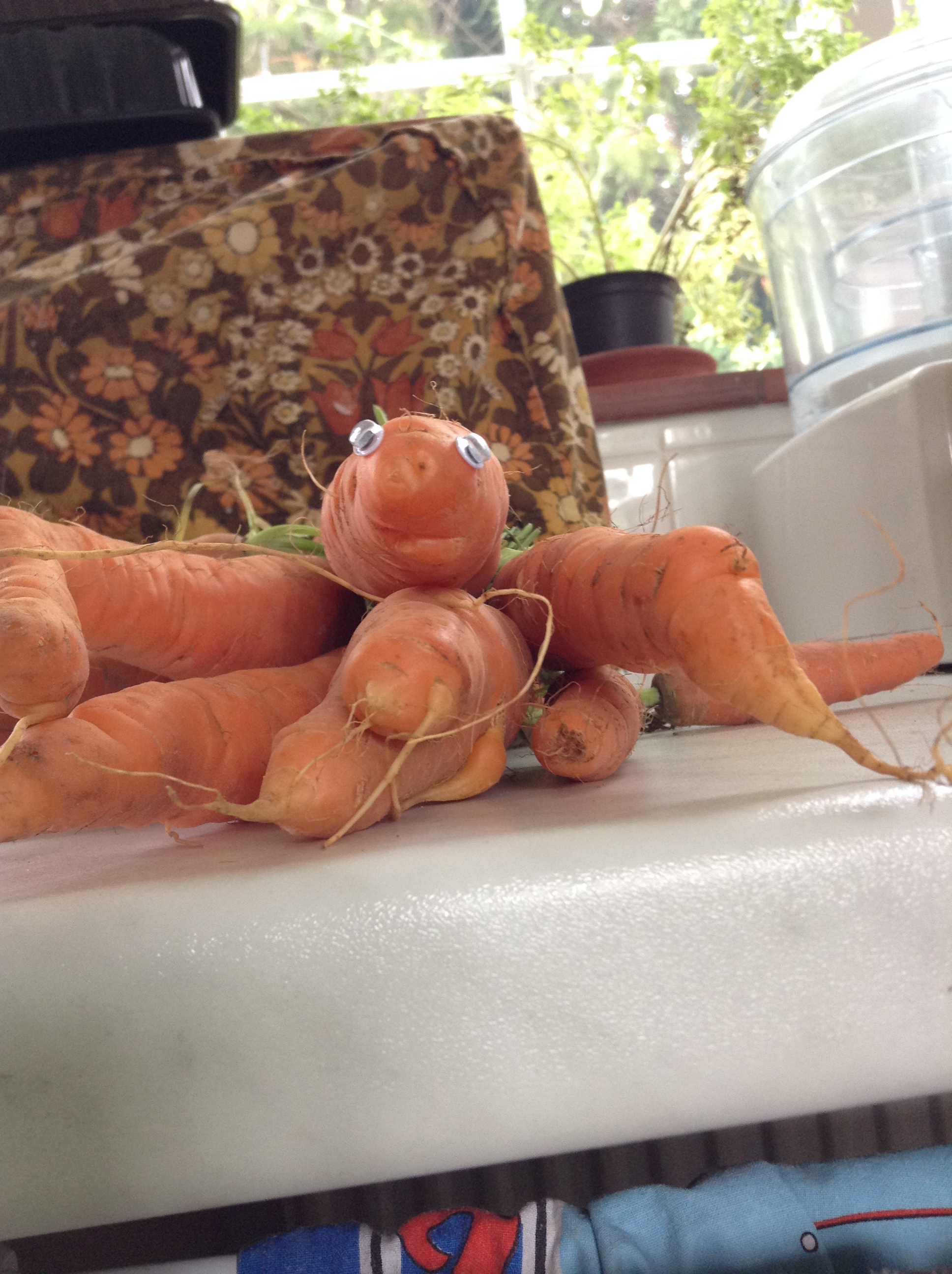 Above, Bolougne, below, Mum’s kitchen: I should have eyebombed the whole bunch of carrots.