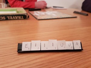 Even the ever-efficient McOther didn’t escape gumbification of his own making. We always play scrabble while we’re on holiday. It’s great fun and we all get the giggles most of the time. Imagine McOther’s consternation when he opened our splendid car boot sale travel scrabble – probably circa about 1967 – only to find that somewhere on its way from his desk to his suitcase the bag with all the tiles in had dropped out. Our first game, then, was called ‘making the tiles’ which we did with paper, snortle. Then there was an added frisson of what would happen if anyone sighed too heavily towards the board or, heaven forfend, sneezed! We did have to remake an R after I laughed too hard, sending the ’tiles’ scattering like confetti, and we were unable to find it afterwards.