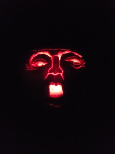 Having whinged, I quite like carving pumpkins. I was hoping to have a go at edgy political satire and make a Donald Trumpkin this year but alas, my cartoon drawing/cutting skills are not quite up there enough to make a suitably recognisable effort, indeed, the only similarity is the colour which doesn’t show in this photo. This year’s pumpkin crop seems to be particularly dense fleshed and thick skinned. Maybe it’s the heat. Good for cooking I may even make it all into pumpkin soup. But tough to carve. Indeed it took so long that I ran out of time to do the hair. As McMini said, I should have done it with a cheese grater, or a blonde wig. Meanwhile several of the people who saw it thought it was a set of ovaries.