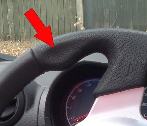 The arrow is actually pointing to the place where I’d put the firing button for the machine guns I will be placing behind the lights at some stage. Except now I’m thinking that if I’ll be inadvertently spraying the streets with fire every time I parallel park it might not be such a good idea. You can see the little trumpet where the hooter button is to the right of the arrow. There’s one of those each side so I have double the opportunities to beep in error like a fucktard.