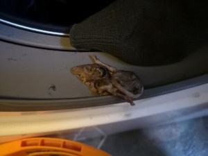 The washing finished as I was on the phone to my Mum. I had the headset on so I could wander round chatting to her as I did other stuff. So I went to empty the washing machine, opened the door and … what was that thing? Eugh, what had McMini put in the pocket of his PE kit? I reached out and picked it up, it was like a bag full of liquid, at which point I realised it had arms and legs and with a small squeak, which was quite restrained of me in the circumstances I thought, I dropped it.