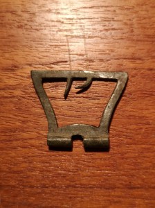 Then things began to look up a little. I found a musket ball, at least I’m pretty sure it’s a musket ball, I’ll need to examine it in better light as it has a blob on it which might be the remnants of a rusty hook, which would make it a weight. Then, with the last signal of the ‘day’ because it was pretty much dark by that time, I found a type V chape, which is the thing you would put behind a shoe buckle if you were a gentleman living between the years of 1670 and 1720. Mine is late and may even be after 1720 because the double pronged ones are usually later. Shoe buckles came in two parts; the chape/tongue and the buckle. Put them together and you are able to buckle up your shoe, clearly, but the joy and practicality of them lies more in the fact you can take them apart.