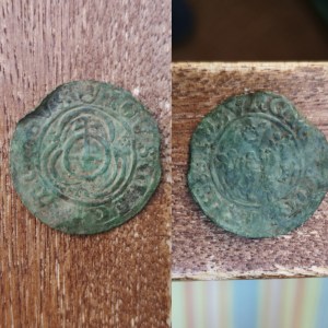 The next session went rather better. I tried the jungle; an overgrown piece of ground near the back of the house where there are fruit trees and an extremely thuggish shrubbery which has subsumed most things. Nobody will be saying ‘Ni’ round here, unless it’s a ‘Ni!’ of disappointment on the grounds of impenetrability. Anyway, on Tuesday, I managed to dig up a medieval jetton from the mid 1700s which was rather exciting.
