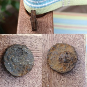 Interestingly, well for me but probably less so for you, I also discovered a pile of what looks like three hammered coins rusted together. They are irredeemably knackered so I am in the happy position of being able to test restoration techniques on them. This is another word for ‘break them’. So far having read a report from a university in the Balkans somewhere, I’ve hit on acetic acid – or a dilute solution of white vinegar. Quite a lot of the kack has come off but I’m none the wiser as to what this thing really is. Never mind. I have also found another musket ball and another little bell since.