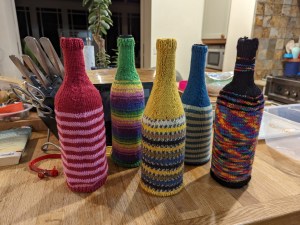 Other self care activities. It was McOther’s birthday and he does a lot of wine tasting. Everyone turns up with a nice bottle, covers it up and then they all try it and try to work out what wine it is. It’s fiendishly difficult but fun and the trick is more about knowing what’s in another person’s cellar than actually tasting the wine. I think I mentioned this a few weeks ago, and that I have been knitting some bottle covers to replace the dodgy socks McOther and friends tend to use to cover up the labels. Anyway, I managed to complete five; one for a friend who was attending and four for his nibs for his birthday.
